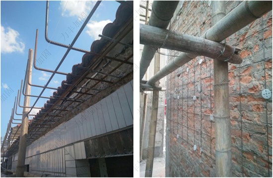 3.寧波市奉化區(qū)江口街道國土所2#樓加固工程:墻體增加鋼筋網(wǎng)片,基礎(chǔ)沉降補錨桿柱,梁柱加大截
